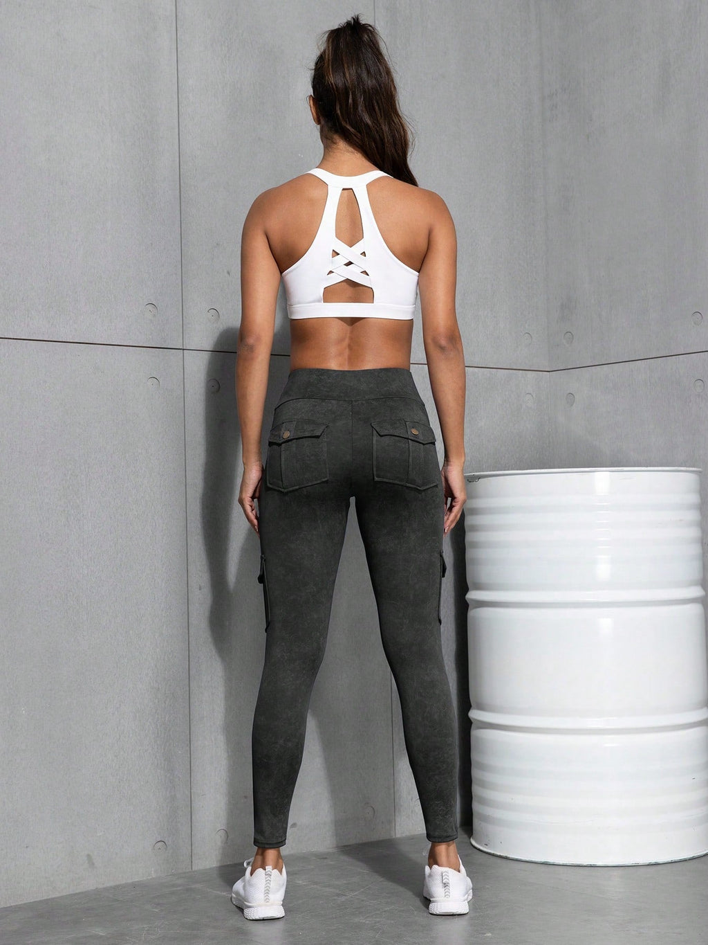 Calça Legging Feminina Bolsos Cargo e Cintura Alta