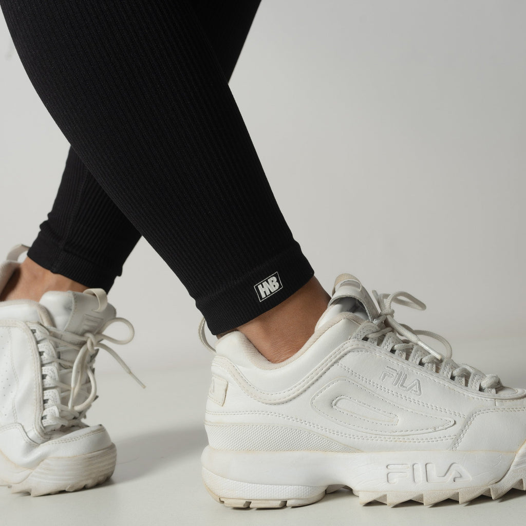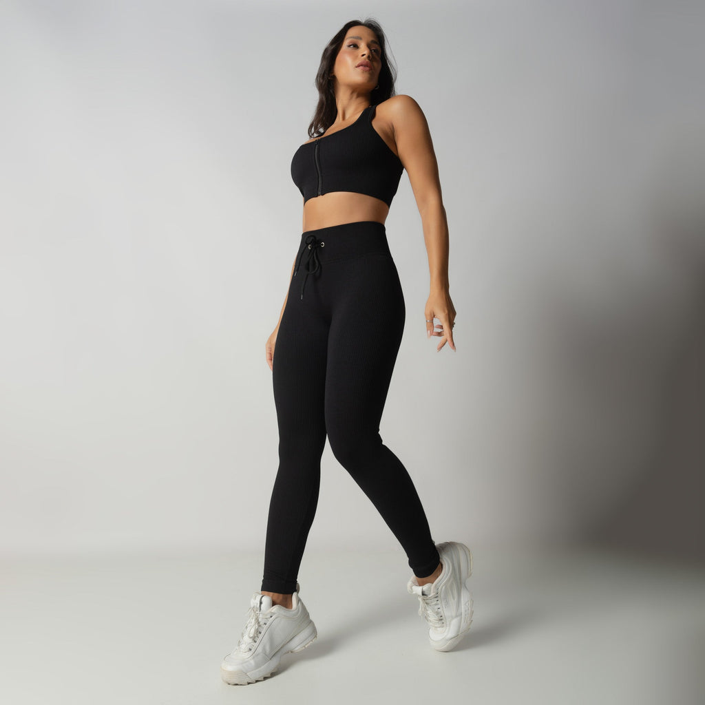 A calça canelada complementa o conjunto com seu cós de alta compressão e cadarço fake, proporcionando um visual moderno e um ajuste perfeito. O acabamento na perna confere uma aparência elegante.